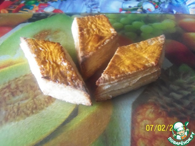 Нарежем ромбиками и уложим на противень. Выпекаем в духовке на среднем огне до позолочения.