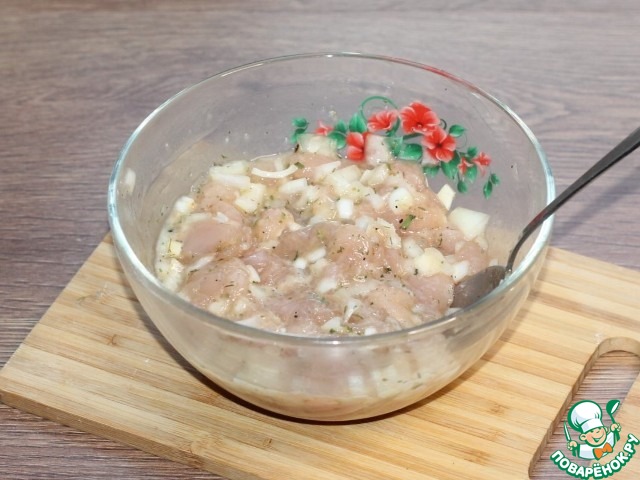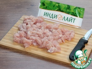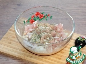 6. Добавляем филе индейки, лук, чеснок, приправу для птички, соль и перец.