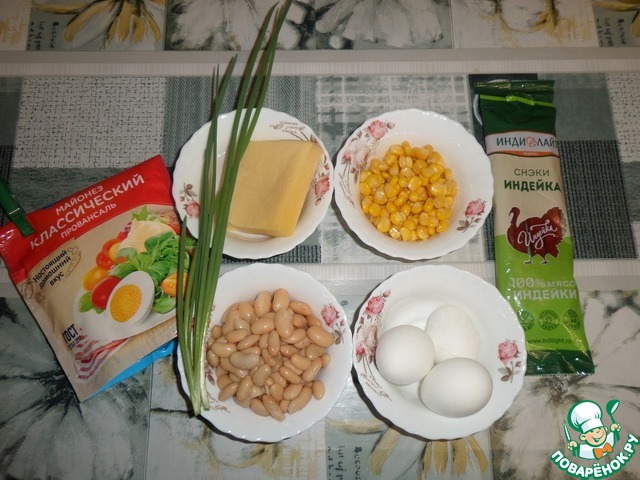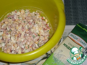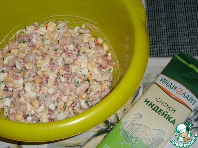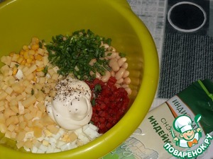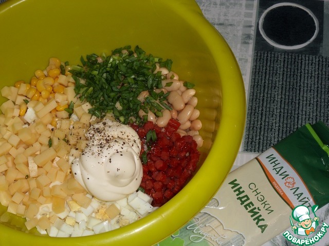 В глубокую миску выкладываем консервированную фасоль и кукурузу, нарезанный сыр, яйцо и колбаски ТМ "Индилайт". Добавляем майонез, соль и молотый перец.
