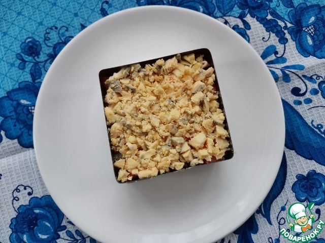 3. - Яичный белок нарезать маленькими кусочками. + Майонез.