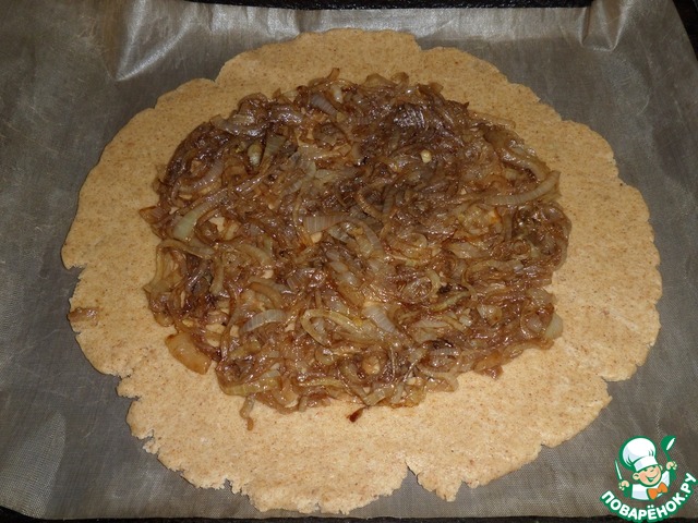 • Затем переносим коврик с лепешкой на противень. Выкладываем на лепешку обжаренный лук. Равномерно его распределяем, не доходя до краев 2-3 см.