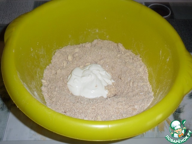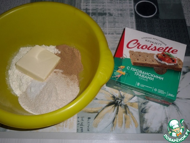 • В глубокую миску выкладываем оба вида муки, измельченные хлебцы, соль и сливочное масло. Перетираем ингредиенты до состояния крошки.