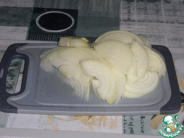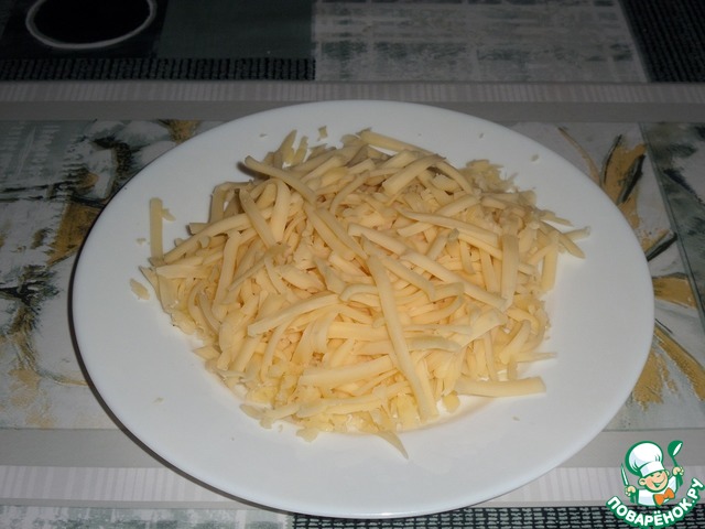 • Поверх лука выкладываем 1/3 часть натертого сыра.