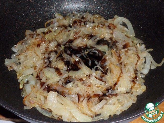 • Затем добавляем в сковороду бальзамический соус. Перемешиваем массу и убираем сковороду с огня.