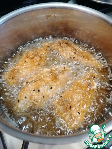 В ковшике разогреть растительное масло и обжарить в нем обваленные в сухой смеси кусочки куриного филе с двух сторон.