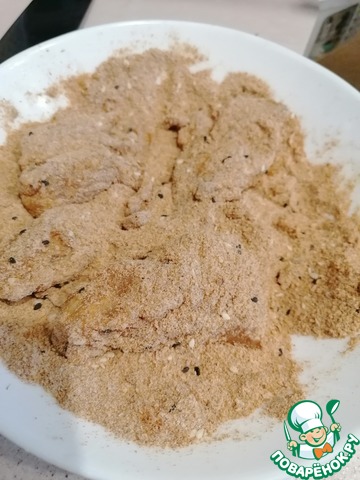 В отдельной чаше смешать 2 ст. ложки муки, 2-3 ст. ложки молотых хлебцов "Kruazett", паприку, травы сухие (у меня орегано), кунжут, можно разных цветов, для красоты, сухую смесь перемешать.