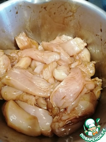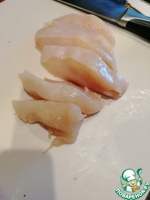 Куриную грудку помыть, нарезать вдоль волокон примерно - 2 см.