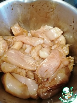 Вымоченную куриную грудку процедить и обсушить бумажным полотенцем, присыпать 2 ст. ложками муки, затем переложить во взбитые яйца.