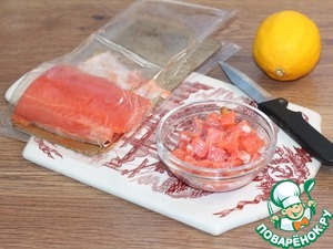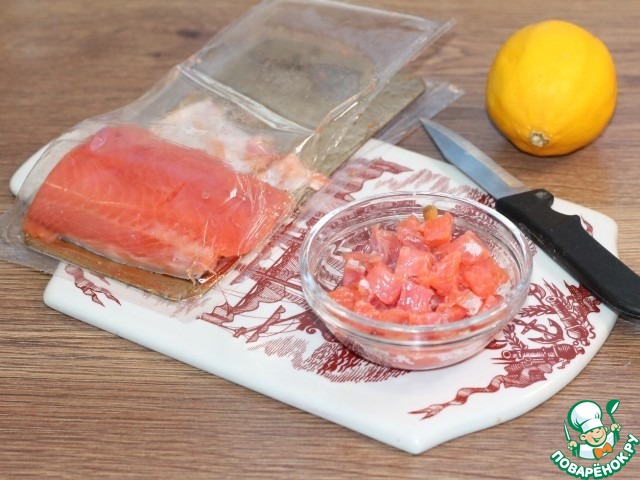 2. Рыбку нарезаем мелким кубиком и сбрызгиваем лимонным соком, перемешиваем и оставляем на 15 минут.