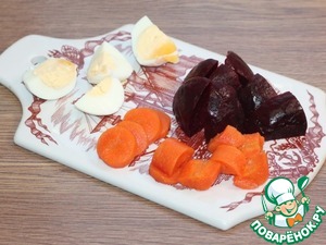 3. Отвариваем морковь, свеклу и куриные яйца, охлаждаем и очищаем. А лучше предварительно отварить.