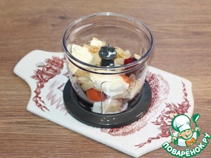 7. Добавляем в чашу блендера лук с чесноком, сливки и сыр. Посыпаем щепоткой душистого перца и приправой, солим и измельчаем до однородности.