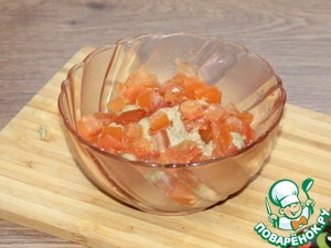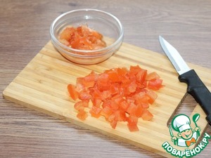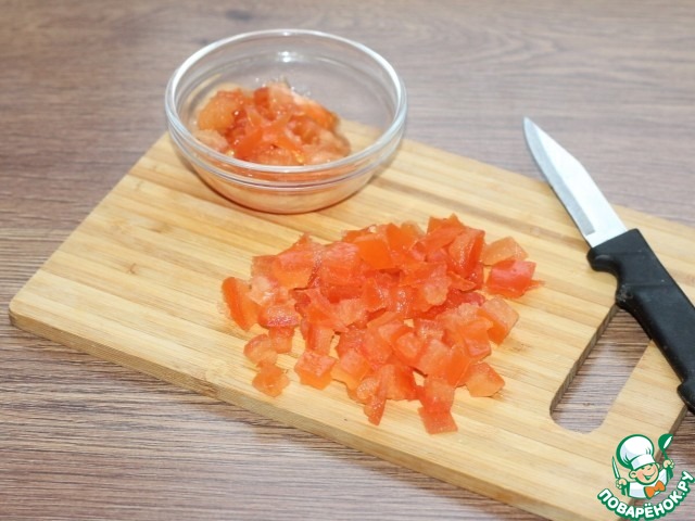 2. У помидора вырезаем мякоть, остальную часть, нарезаем маленькими кубиками.
