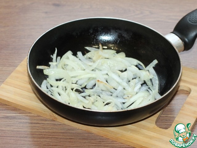 3. Лук и чеснок очищаем, лук нарезаем полукольцами и мелко рубим чеснок. Обжариваем овощи на разогретом растительном масле до "прозрачности", минуты 3.