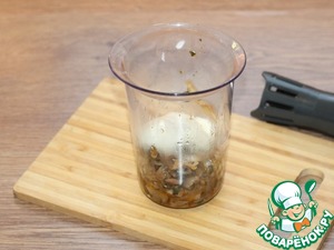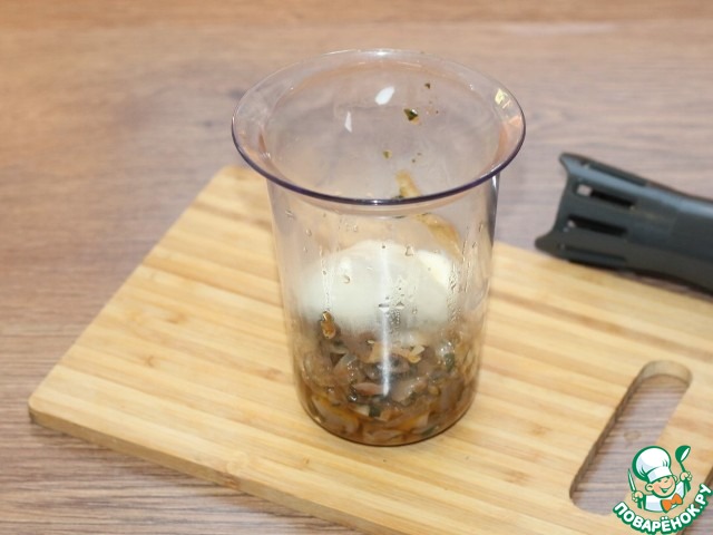 7. Перекладываем зажарку в чашу блендера. Добавляем мягкий сыр и измельчаем блендером.