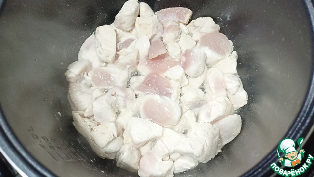 Отправляем в чашу половину масла и филе - Режим «Жарка» 12 минут (Не забываем перемешивать каждые 2-3 минуты). Желательно готовить с открытой крышкой.