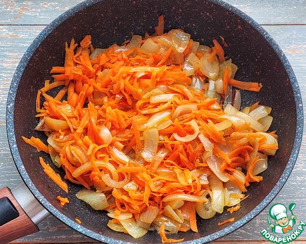 Морковь почистить, помыть, натереть на крупной тёрке и добавить к луку. Обжаривать ещё 2 мин.