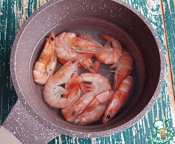 Креветки залить горячей водой и оставить на 10 мин. размораживаться. Затем очистить их, хвостики можно оставить.