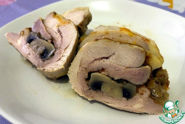 Мясо посыпать специями, выложить грибы, натёртый сыр, скрутить в рулет. Заворачиваем рулет в пищевую плёнку, перевязать ниткой, завернуть в фольгу или кулинарный пакет.