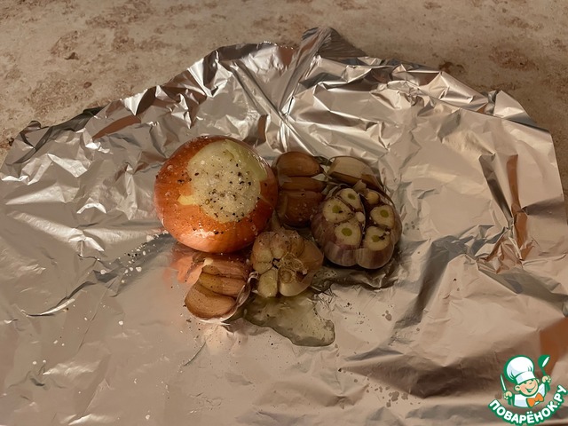Чеснок и лук после запекания должны стать мягкими, разминаться ложкой при соприкосновении. "Выдавить" зубчики чеснока и лук из кожуры.