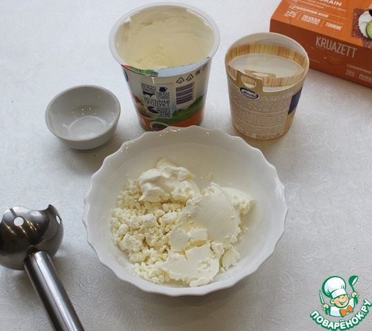 • В чашку выложите творог, сыр творожный, сметану и пробейте блендером. Вжик, вжик и готово. Пол дела сделано.