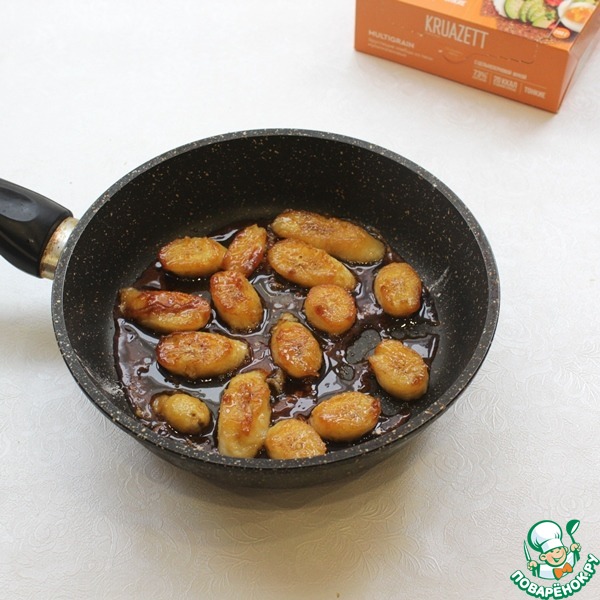 • Растопите коричневый сахар на умеренном огне до появления сиропа, покачивая антипригарную сковороду с толстым дном, чтобы сахар равномерно топился и выложите в карамель кружки банана, протомите по 1 минуте с каждой стороны.