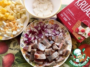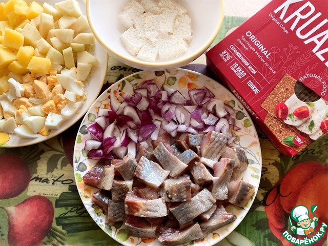 Отварите картофель в мундире, остудите, очистите от кожуры и нарежьте кубиками. Яблоко также очистите, удалите кожуру и нарежьте кубиками. Отварите яйцо, почистите и также нарежьте кубиками. Селёдку почистите, отделите филе, удалите все кости. Подготовленное филе нарежьте на кусочки. Половину небольшой красной луковицы нарежьте кубиками. 1 ломтик батона нарежьте на кусочки и замочите на 10 минут в молоке, после чего хорошо отожмите.