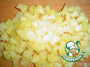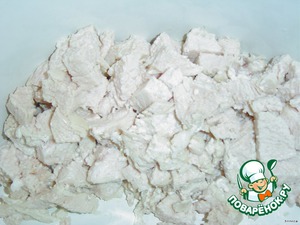 • Куриное мясо отварить в подсоленной воде и нарезать кубиками.