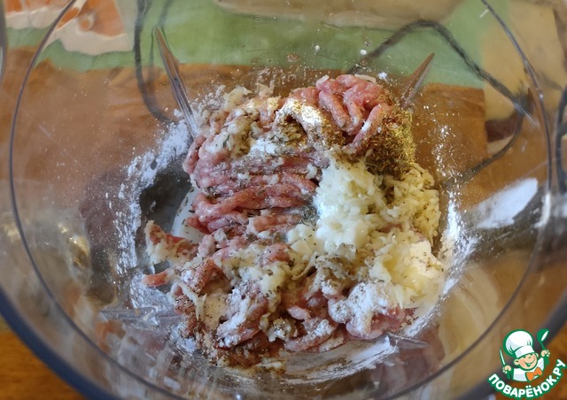 Выкладываем фарш и специи (крахмал, чеснок, соль, перец, тимьян) в отдельную ёмкость, добавляем туда воду с растворённой содой и всё хорошо перемешиваем до однородной консистенции.