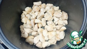Отправляем в чашу воду смешанную с оставшимися 15 гр крахмала и 1 ч. л. соли, и кусочки курицы - Режим "Жарка" 4-5 минут. (Не забываем перемешивать каждые 1-2 минуты).