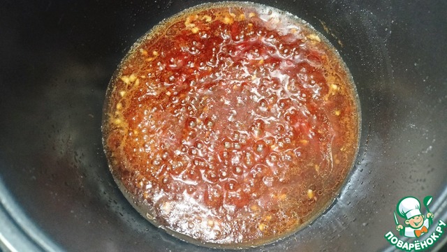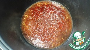 Отправляем в чашу соевый соус, уксус, кетчуп, чеснок и сахар - Режим "Жарка" 4-5 минут. (Не забываем перемешивать каждые 1-2 минуты).