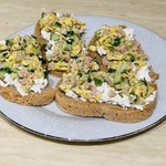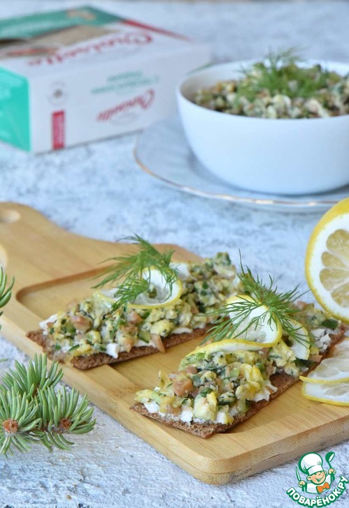 На хлебцы "Круазетт" наношу слой творожного сыра и щедрую порцию готового салата.