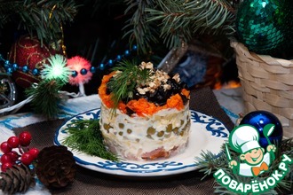 7. Формочки (8 см) для формовки салата смазываем растительным маслом и кладем на блюдо. Смазываем дно майонезом.