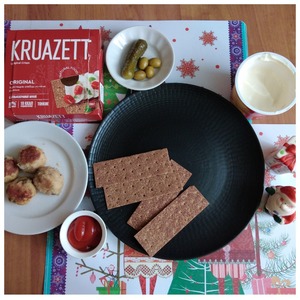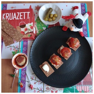 Канапе на ржаных цельнозерновых хлебцах КРУАЗЕТТ с куриными жареными тефтельками.