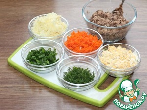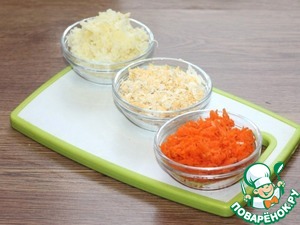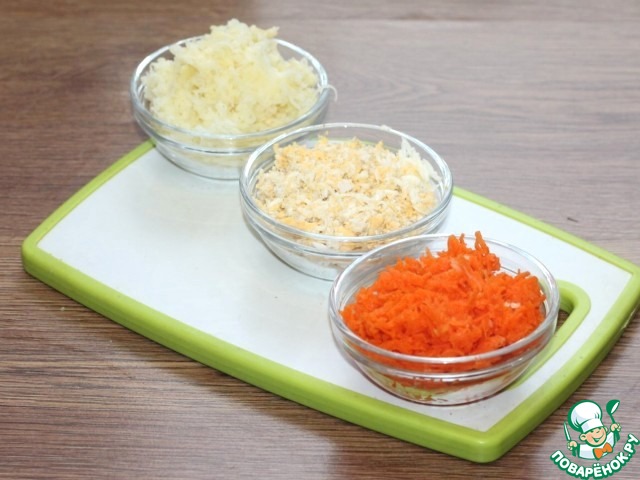 4. Овощи и яйца очищаем и трем по отдельности на средней терке.
