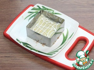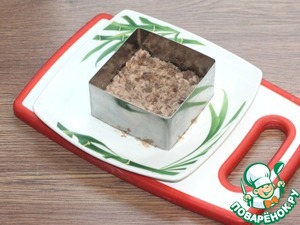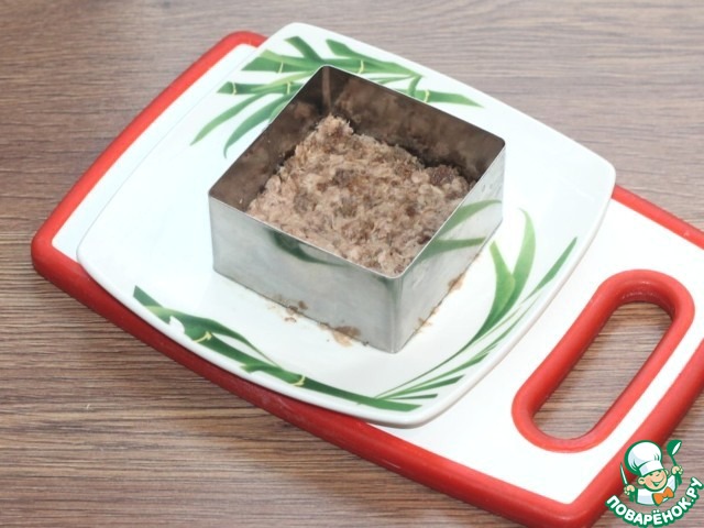 7. Приготовим слоеный салат на двоих. Берем 2 формочки 8*8 см и смазываем внутри растительным маслом.