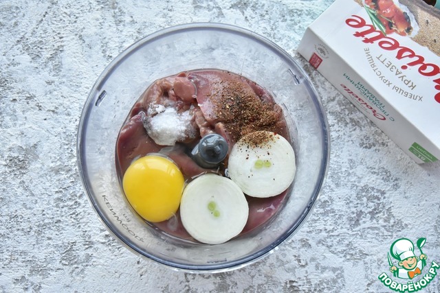 В измельчитель выкладываю подготовленную куриную печень, сырое яйцо, луковицу, соль, молотый перец.