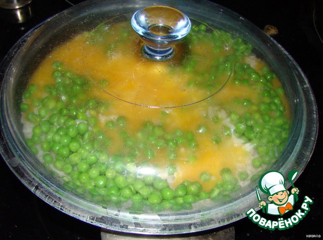 Через 10 минут после начала варки риса (Вода должна уйти внутрь под рис.. высыпаем в рис горох... закрываем крышкой (НЕ МЕШАЕМ)