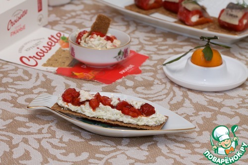 Для подачи закуски использую хлебцы ТМ "Круазетт". На хлебец намазать сливочно-творожную намазку, затем выложить слой нарезанного мелким кусочком перца.