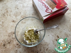 Смешать сливочный творожный сыр, измельченный зубчик чеснока, натертый на средней терке маринованный огурчик. Довести до вкуса, добавив по необходимости перец и соль.