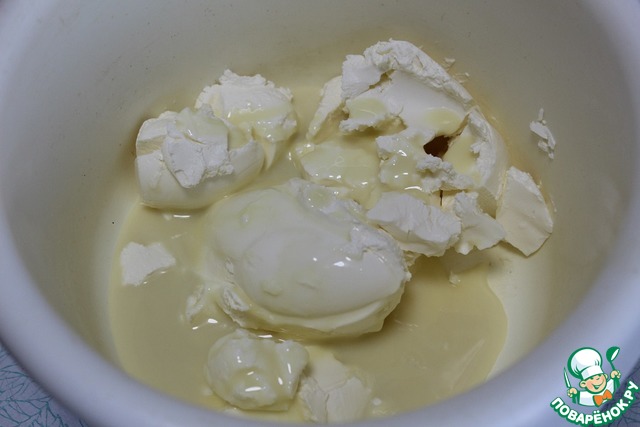 В чашу выложить маскарпоне и сгущеное молоко.