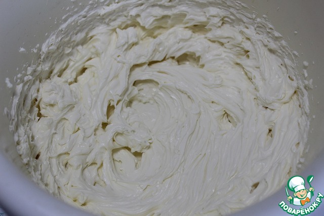 Взбить маскарпоне со сгущеным молоком в однородную массу.