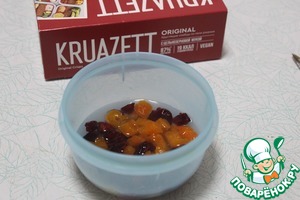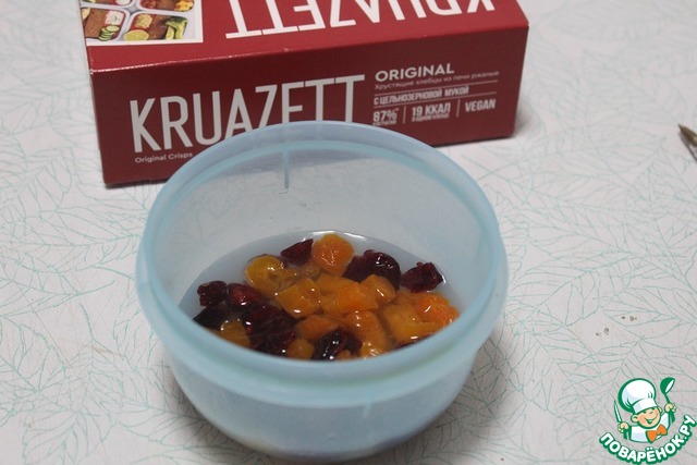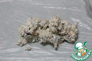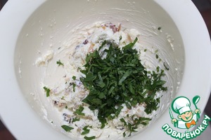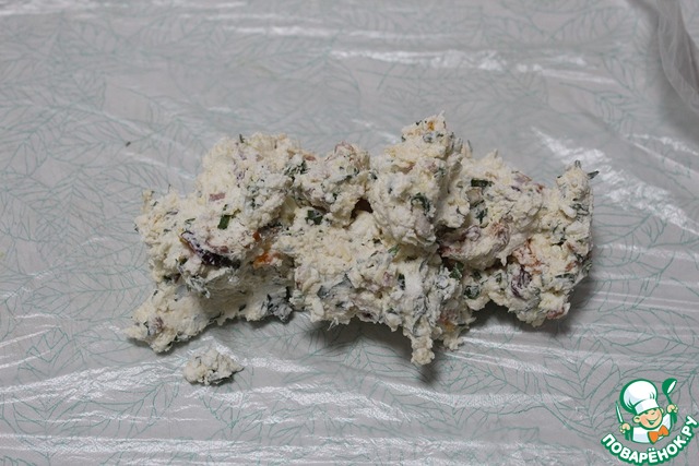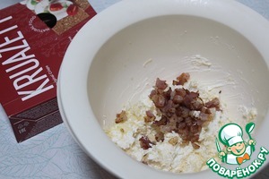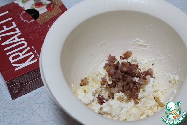 • В чашу выложить сыры, добавить бекон, сухофрукты и хорошо перемешать.