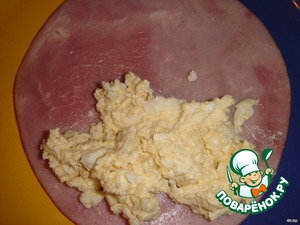 На край каждого кусочка ветчины положить немного начинки и свернуть свиток. -