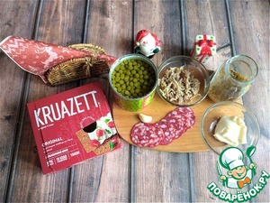 Готовим продукты для закуски. Я буду делать с ней бутерброды открытые на ржаных цельнозерновых хлебцах КРУАЗЕТТ с паштетом из зелёного горошка и сливочного сыра с чесноком и дополню их мясными копчёными изделиями. С копчёнкой вкуснее бутерброды, проверенно. Я сделаю половину бутербродов с колбасой полу-копчённой "Брауншвейгская" и половину - с мякотью копчённой курицы, разобранную на волокна. Дополню по вкусу дижонской горчицей. Это по желанию.