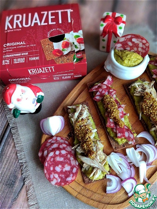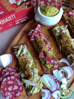 Отличная закуска для крепких напитков на праздничный стол для гостей и близких. Быстро и просто, с отличным результатом! Хлебцы ржаные цельнозерновые хрустящие и тонкие КРУАЗЕТТ просто созданы для этих бутербродов! Готовьте! Не пожалеете! И купите обязательно эти хлебцы!