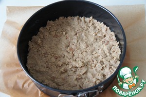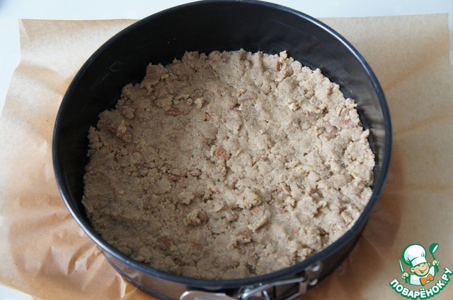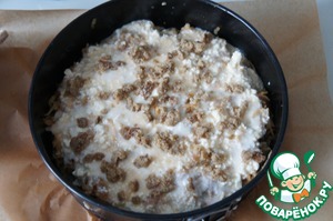 В форму выложите овсяно-хлебную смесь. Не всю, отложите примерно четверть.