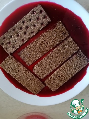 Разморозить вишню. Сок от вишни слить, добавить немного воды. Промокнуть хлебцы в соке. Чтобы они быстрее пропитались, можно сок немного подогреть.