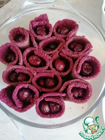 Как хлебцы станут мягкими, можно заворачивать в них вишню и уложить в форму.