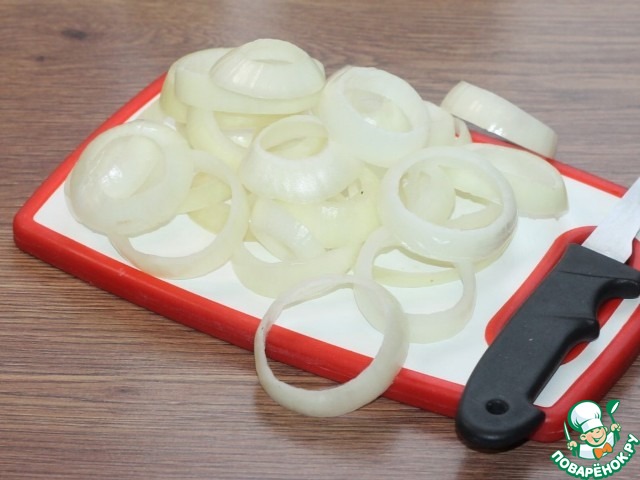 3. Лук очищаем и нарезаем кольцами. Аккуратно разделяем каждое колечко.