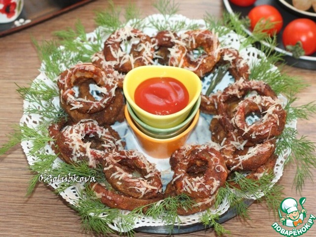 8. Выкладываем кольца на большое блюдо и посыпаем тертым сыром, подаем с соусом.